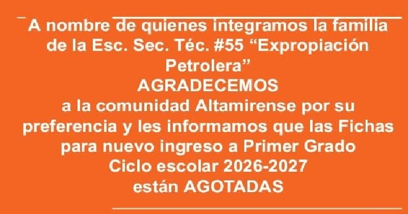 TAMPICO, TAMAULIPAS.- La Escuela Secundaria Técnica número 55 Expropiación Petrolera notificó el fin del proceso de entrega de fichas para alumnos de nuevo ingreso.