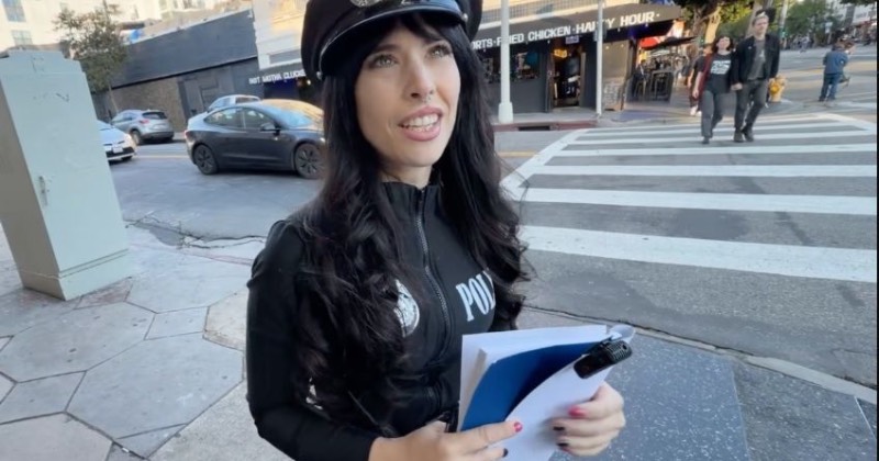 Con una gorra, un uniforme negro y una placa falsa, salió a las calles de Hollywood para jugarle la broma a los transeúntes, sin embargo, al encontrarse con un sujeto sentado para la infracción fraudulenta, se le indicó de inmediato que no quería su cámara en el rostro, por lo que ella y su camarógrafo se alejaron para evitar mayores confrontaciones.