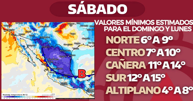 Para la región cañera, el termómetro podría descender a rangos de 11 a 14 grados, en tanto que en el sur se esperan mínimas de 12 a 15 grados centígrados.