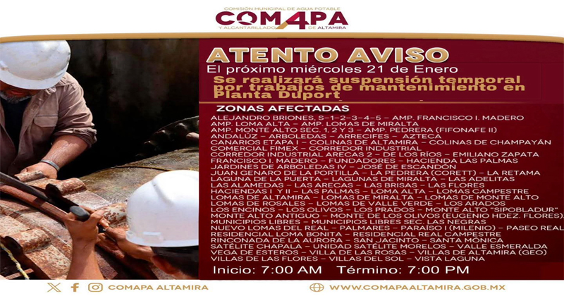 La Comapa Altamira, a cargo de Gabriel Arcos Espinosa, informó que el corte iniciará a partir de las 7:00 a.m. del próximo 21 de enero de 2026.
