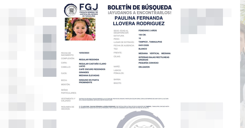 TAMPICO, TAM.- A pesar de que este lunes trascendió la presunta localización de la pequeña Paulina Fernanda, de apenas dos años de edad, su familia desmintió dicha versión y aseguró que la menor continúa desaparecida.