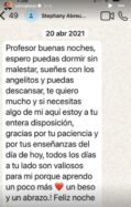 «Te quiero mucho y si necesitas algo de mi aquí estoy a tu entera disposición, gracias por tu paciencia y por tus enseñanzas», se lee en el mensaje.