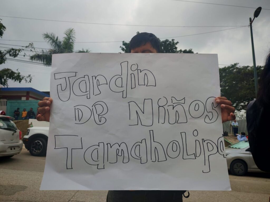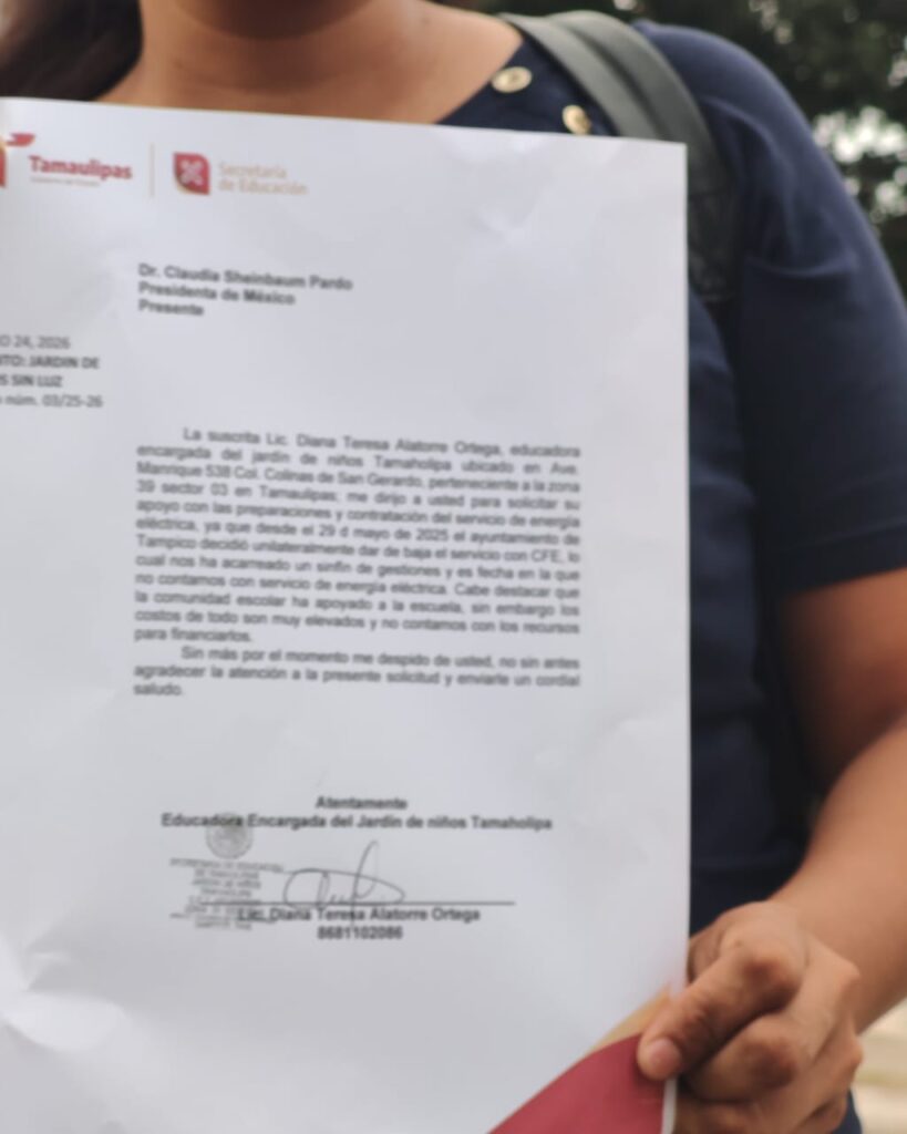 TAMAULIPAS, MÉXICO.- Entre gritos de “Presidenta, en el kínder Tamaholipa aquí enfrente no tenemos servicio”, madres de familia y personal del jardín de niños Tamaholipa solicitaron la intervención de la presidenta de la República, Claudia Sheinbaum Pardo, ante la falta de energía eléctrica que afecta al plantel desde mayo del año pasado.