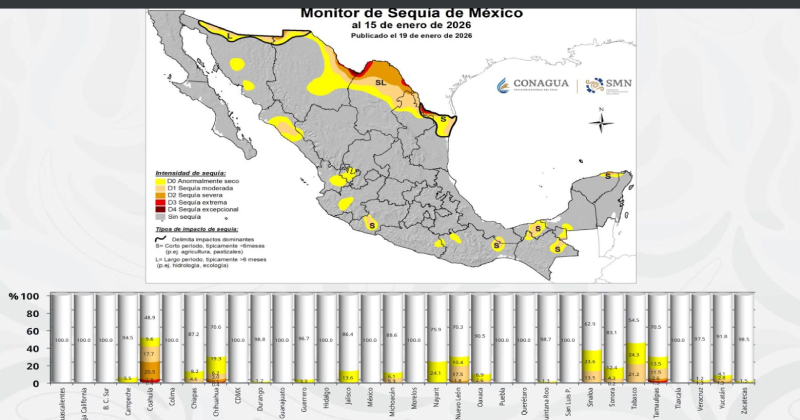 En base al Monitor de Sequía en México de la Comisión Nacional del Agua (Conagua), con corte al 15 de enero de 2026, el panorama estatal muestra que el 29.5 por ciento del territorio de Tamaulipas ya presenta algún grado de sequía, mientras que el 70.5 por ciento permanece, por ahora, sin afectación.