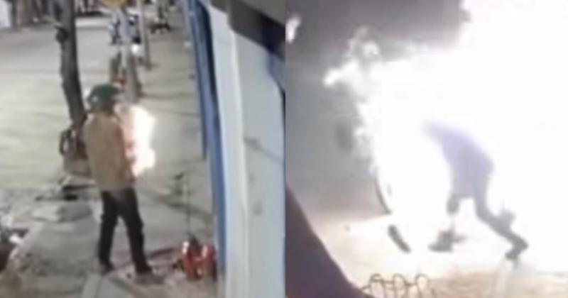 Las imágenes captadas, muestran el momento en que las llamas le alcanzan los brazos y las piernas del delincuente, aparentemente porque su ropa y la motocicleta estaban impregnadas de combustible.