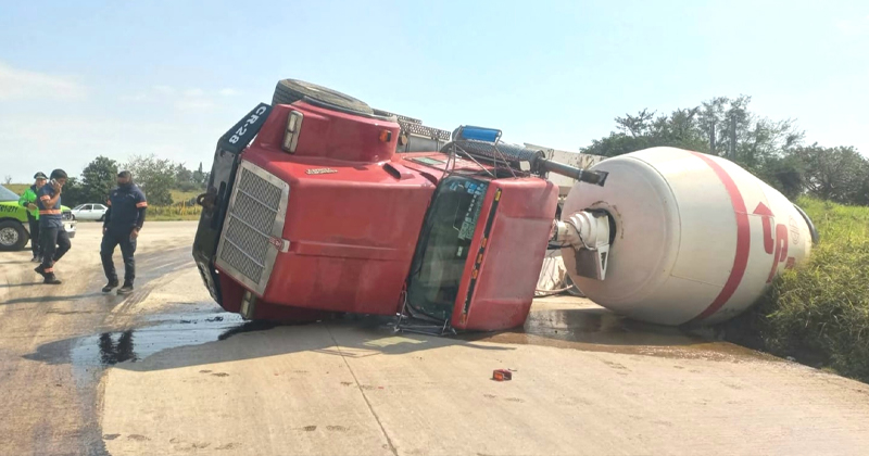 Aparatosa volcadura de un camión de los denominados «trompo», se registró la mañana del martes en un libramiento de Pueblo Viejo, Veracruz.