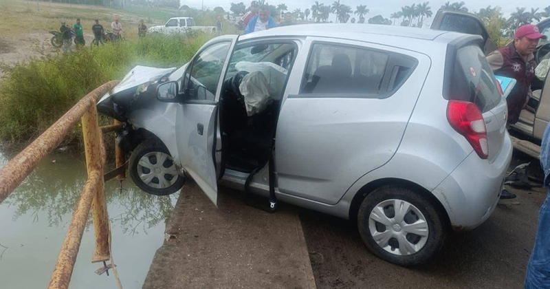Un automóvil terminó incrustado en el barandal de un puente y a punto de caer a una laguna luego de chocar en el camino vecinal hacia el ejido 3 de Mayo.