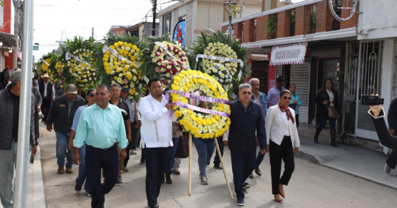 ALTAMIRA, TAMAULIPAS.- En un acto solemne de memoria histórica y reconocimiento al legado agrarista del municipio, el alcalde de Altamira, Dr. Armando Martínez Manríquez, encabezó la procesión y colocación de una ofrenda floral en honor a los Mártires del Agrarismo Altamirense, con motivo del XCVI Aniversario Luctuoso de Martín A. Martínez y Ciro Rodríguez Pimentel.
