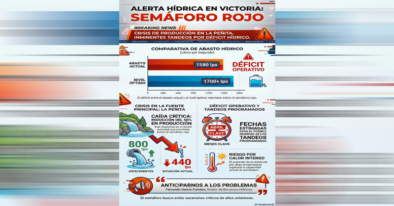 CIUDAD VICTORIA, TAMAULIPAS.- Victoria permanece en semáforo rojo por la disminución sostenida en la producción del manantial La Peñita, principal indicador del nivel de alerta hídrica en la capital, y la autoridad no descarta que los tandeos regresen en los próximos meses si aumenta la demanda.