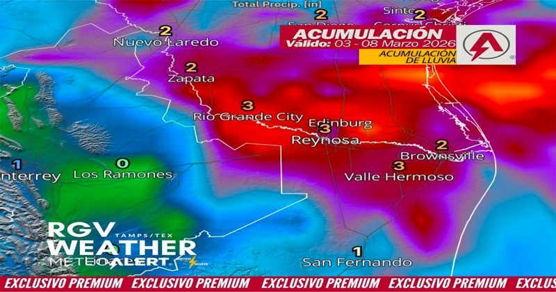 Con datos exclusivos de la agencia Meteo Alert Norte, se proyectan acumulados de hasta 3 pulgadas (alrededor de 75 milímetros) en zonas como Reynosa y Valle Hermoso.