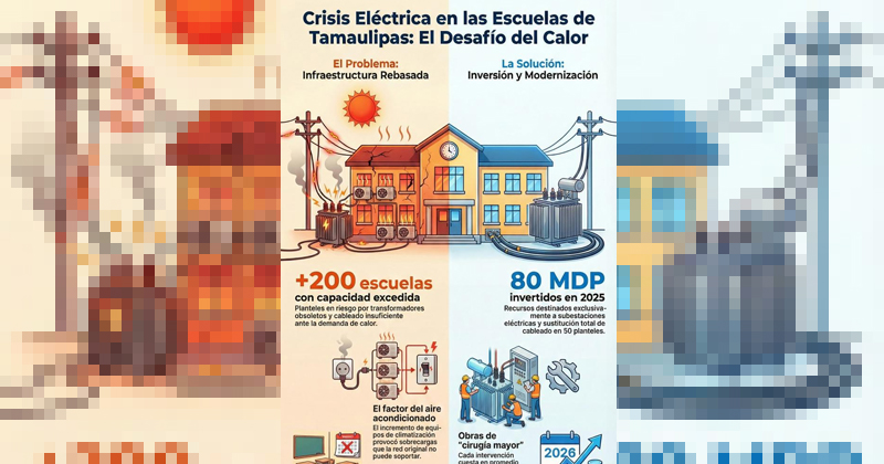 CIUDAD VICTORIA, TAM.- El calor ya rebasó la capacidad eléctrica de más de 200 escuelas en Tamaulipas. Transformadores obsoletos, cableado insuficiente y sobrecargas provocadas por el uso de aire acondicionado colocan a estos planteles en riesgo justo antes de la primavera y verano.