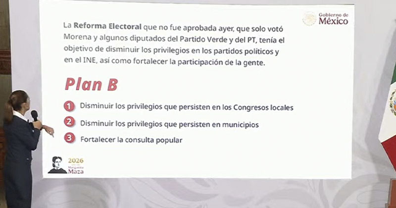 La presidenta Claudia Sheinbaum Pardo anunció este jueves que el próximo lunes 16 de marzo enviará al Congreso de la Unión el denominado Plan B de la iniciativa de Reforma Electoral, una propuesta centrada en reducir privilegios en congresos locales y municipios.