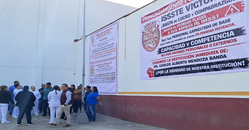 En paralelo, trabajadores sindicalizados del propio ISSSTE colocaron mantas de protesta en el exterior de la clínica, donde denunciaron nepotismo y compadrazgo en la asignación de plazas.