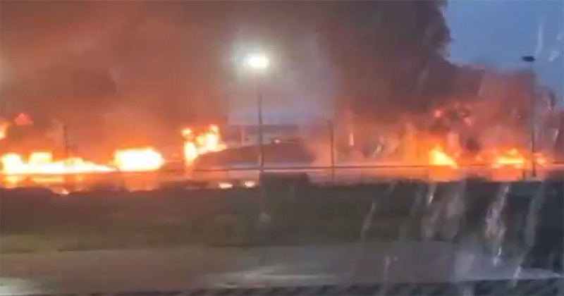 Tremendo incendio en el predio 1 de almacenamiento en la Refineria Olmeca Dos Bocas, Paraíso, Tabasco. En medio de la lluvia los trabajadores fueron evacuados. Se suspendieron trabajos. @Pemex pic.twitter.com/u7Q95uH8OZ