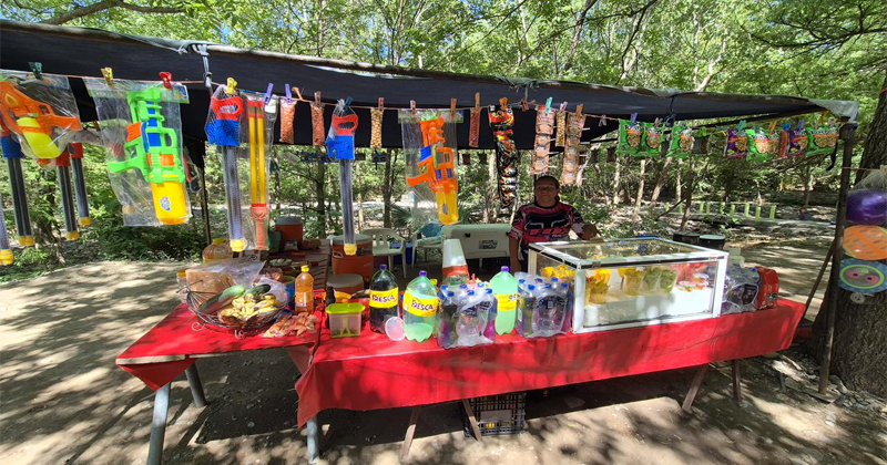 Pero la oferta no termina ahí. En su puesto también se pueden encontrar chamigomas, vasos de fruta, elotes cocidos, raspas de vainilla y platanadas, opciones que complementan la experiencia de quienes acuden en familia a disfrutar del entorno natural.