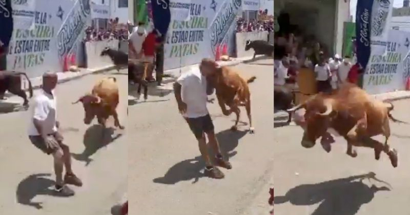 Un encierro taurino casi termina en desastre luego que un toro literalmente saltó para embestir a un hombre, quien escapaba de una estampida de bureles ocurrida en los festejos patronales de San José.