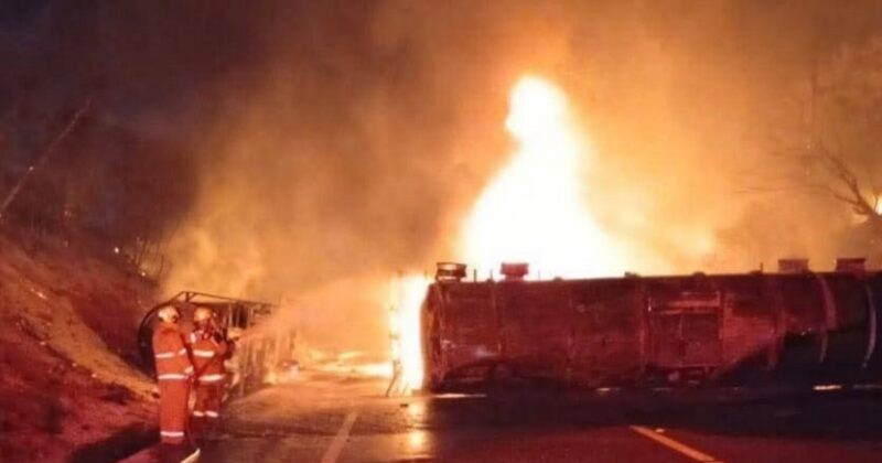 El accidente tuvo lugar en el kilómetro 9 de la carretera Rumbo Nuevo. Una cisterna cargada con miles de litros de gasolina y un tráiler de doble remolque que transportaba químicos lubricantes colisionaron después de que al primero se le desprendiera el contenedor, lo que derivó en un fuerte impacto y un incendio que consumió por completo ambos vehículos.