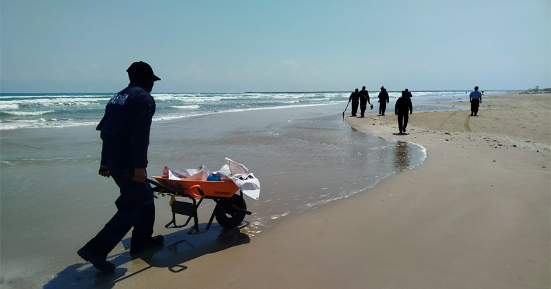 Elementos de la Secretaría de Marina recorren a pie la playa Miramar, buscando minuciosamente restos de hidrocarburos. Cada fragmento, por pequeño que sea, es cuidadosamente recolectado.