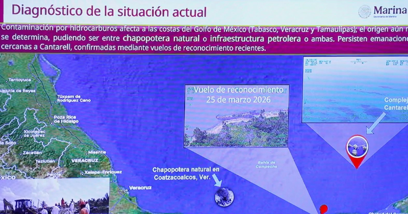 «La fuente que sigue activa y creemos que es la que más contaminante ha vertido es la correspondiente a las chapopoteras naturales que están en Cantarell, en Sonda de Campeche, estas chapopoteras tienen una emanación permanente, natural, sin embargo, ha habido un mayor flujo de contaminante en el último mes.