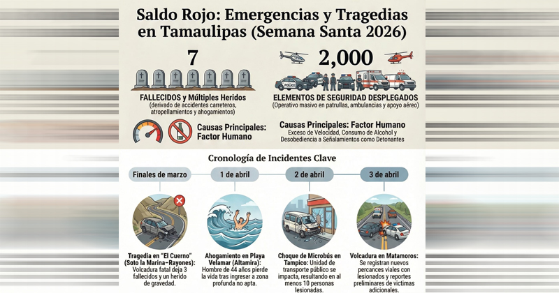 TAMAULIPAS, MÉXICO.- El periodo vacacional de Semana Santa 2026 en Tamaulipas comenzó con un saldo preliminar de al menos siete personas fallecidas y varios incidentes carreteros y acuáticos, de acuerdo con un análisis de reportes oficiales, notas periodísticas y publicaciones verificadas. Aunque las autoridades estatales no han emitido un corte consolidado diario, la información disponible permite trazar un panorama de riesgo en playas, carreteras y zonas urbanas.