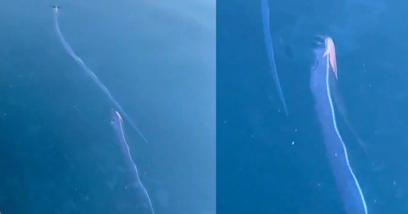 Frente a las costas de Fukui han sido grabados estos dos peces remo, también conocidos como el Pez del Juicio Final, fueron vistos nadando juntos en este puerto japonés.