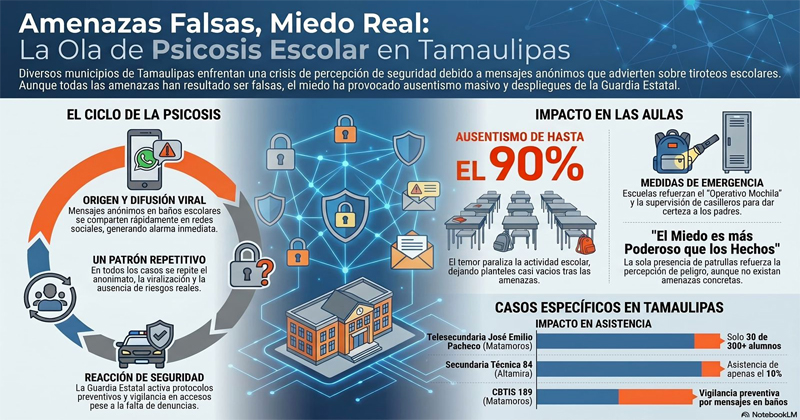 El verdadero problema es que estas amenazas, aun siendo falsas, ya están generando una crisis de percepción de seguridad escolar en Tamaulipas. Las familias ven patrullas en las entradas, operativos en las escuelas y grupos de padres alarmados en redes sociales; eso basta para instalar la idea de que existe peligro, aunque no haya una amenaza concreta. El miedo se vuelve entonces más poderoso que los hechos.