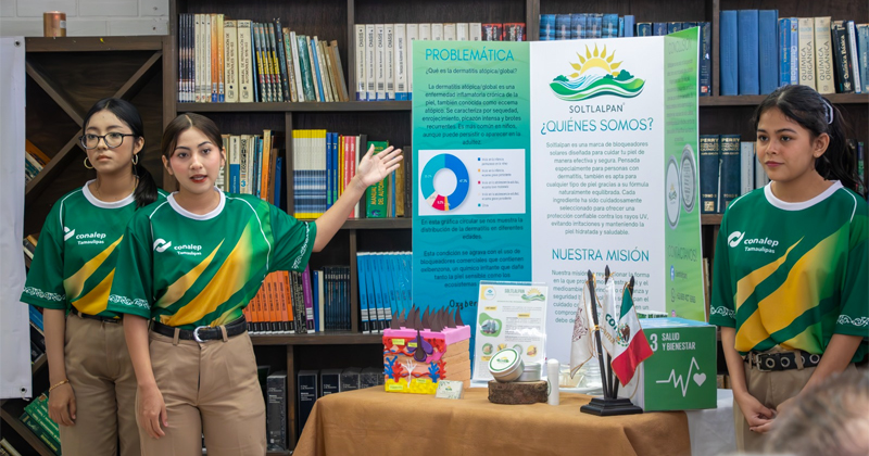 Uno de los puntos centrales fue el impulso al proyecto “Soltlapan”, un bloqueador solar dirigido a personas con dermatitis, creado por las alumnas Sarahí Gámez Juárez, Dulce Marely Sánchez Hernández y Jessica Miranda Rocillo Vera, de cuarto semestre de Química Industrial.