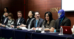 Blue Demon se paseó por los pasillos del Senado, y por el pleno de la Comisión Permanente, en donde saludó y se tomó fotos con distintos legisladores.