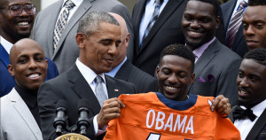 El presidente de Estados Unidos, Barack Obama, recibió a los campeones Broncos de Denver este lunes en la Casa Blanca.