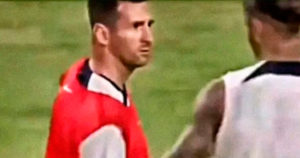 El delantero argentino del PSG Lionel Messi mostró su inconformidad después de recibir un golpe del zaguero español Sergio Ramos durante la práctica del PSG