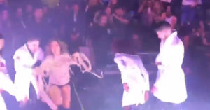 En un video se observa a la intérprete cuando da un trago a una botella de agua y corre hacia un grupo de espectadores