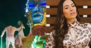 La conductora sufrió el incidente mientras estaba en un carro alegórico. El momento se volvió viral en redes sociales.