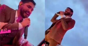 Tras ser tocado de forma indebida, el cantante solo atina a sonreír desconcertado y de inmediato retira la mano de la mujer y se levanta mientras continúa cantando.