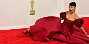 Lisa Koshy sufrió un pequeño traspié durante su paso en la alfombra roja de los Premios Oscar