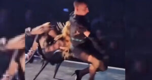 El clip de pocos segundos muestra a la «reina del pop» tirada en el suelo, pero no perdió el estilo y con todo y tacones salió corriendo a terminar el show