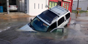 Un enorme socavón que se formó en la avenida Plan de Ayutla y Nafarrete, se tragó una camioneta en la que viajaban una pareja y una bebé, aunque por fortuna no resultaron heridos.