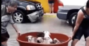 En una grabación se puede ver a ambos transportar a los animales en una tina, la cual no fue tan difícil de transportar ya que las calles están completamente cubiertas por el agua