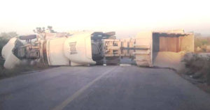 Atravesado sobre la cinta asfáltica quedó el tráiler, propiedad de la empresa mencionada, que se volcó a escasos tres kilómetros antes de llegar al ejido las Norias, cuando venía procedente del banco de material, ubicado en el ejido el Milagro.