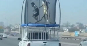 Un clip que está dando la vuelta en las redes sociales muestra el momento en que en los carriles centrales de una vía rápida, una camioneta lleva instalada una estructura metálica para sostener el brincolín