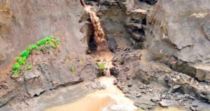 Debido a las precipitaciones pluviales de las últimas semanas se formó una caída de agua en forma de cascada en el interior del socavón