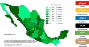La Secretaría de Salud informó, a través de su informe técnico, que en México los casos positivos de covid-19 ascendieron a 2,741,983, sumando 15,823 nuevos contagios