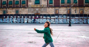 En la imagen se puede apreciar a una niña corriendo con lo que parece ser un papalote y de fondo se ven las vallas instaladas frente a Palacio Nacional