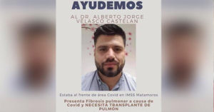 Alberto Jorge Velasco Castelán, médico del Instituto Mexicano del Seguro Social (IMSS) en Matamoros, se encuentra internado en un hospital de Monterrey y requiere un trasplante de pulmón.