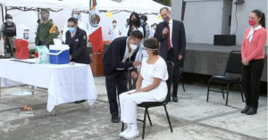 El presidente López Obrador encabeza la aplicación del medicamento a María Irene Ramírez, enfermera de terapia intensiva en el Hospital Rubén Leñero;