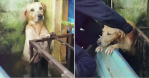 El perrito estaba con la mitad de su cuerpo bajo el agua, parado sobre sus dos extremidades inferiores, sosteniéndose de la estructura metálica de una vivienda.