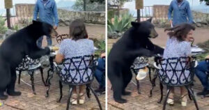 Un ejemplar se acercó a la mesa de una pareja para devorar sus alimentos; sin embargo, aparentemente se asusta al verse rodeado y lanza un manotazo
