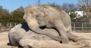 La elefanta Magda sujeta la trompa de su compañera muerta con la suya, negándose a dejarla sola.