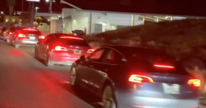 Alrededor de 50 autos permanecieron en fila para esperar su turno en el centro de recarga de las baterías con las que funcionan los vehículos eléctricos.