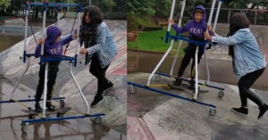 Las imágenes que han conmovido a usuarios de internet, fueron registradas en la ciudad de Porto Alegre cuando el niño se desplazaba en un dispositivo con ruedas manteniéndose sujeto gracias a cuatro arneses que le rodeaban la cintura.