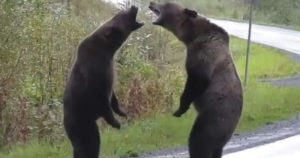 Dos grandes osos grizzly fueron capturados en video peleando en medio de una carretera en Canadá.